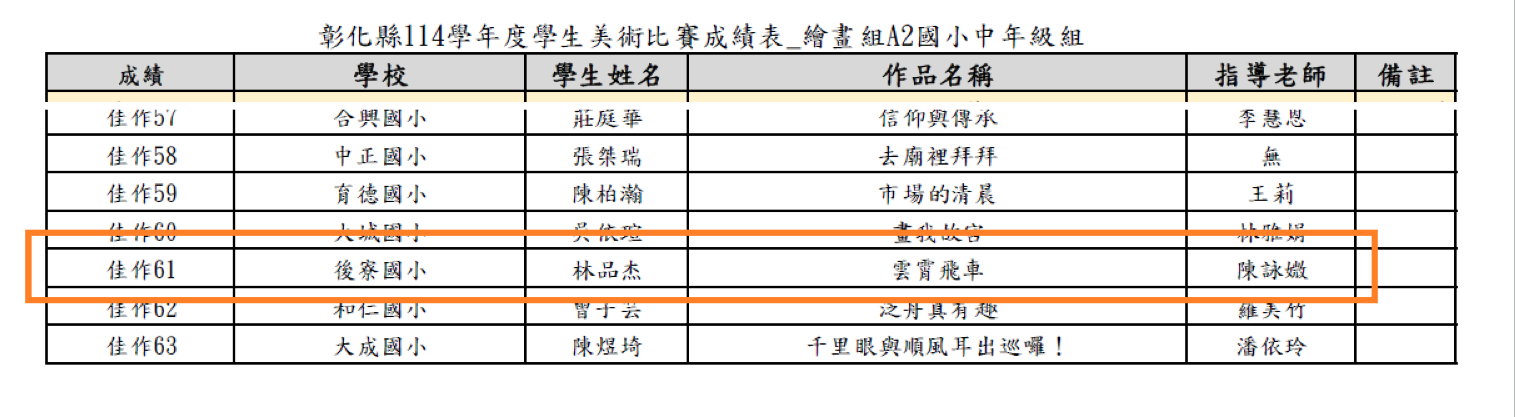 恭喜本校學生參加「彰化縣114學年度美術比賽」榮獲繪畫類佳作!