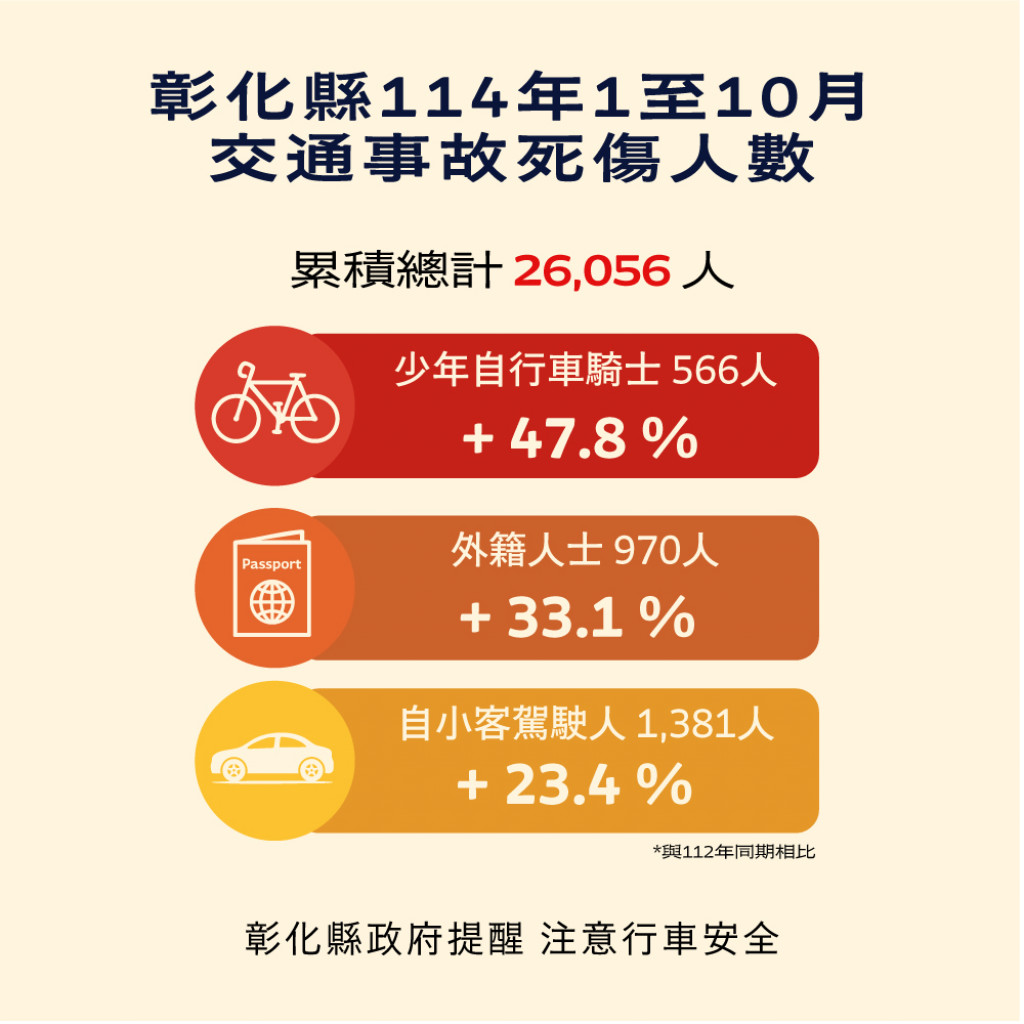 彰化縣114年1-10月道路交通事故死傷累計26,056人,請家長與小朋友確實遵守交通規則。