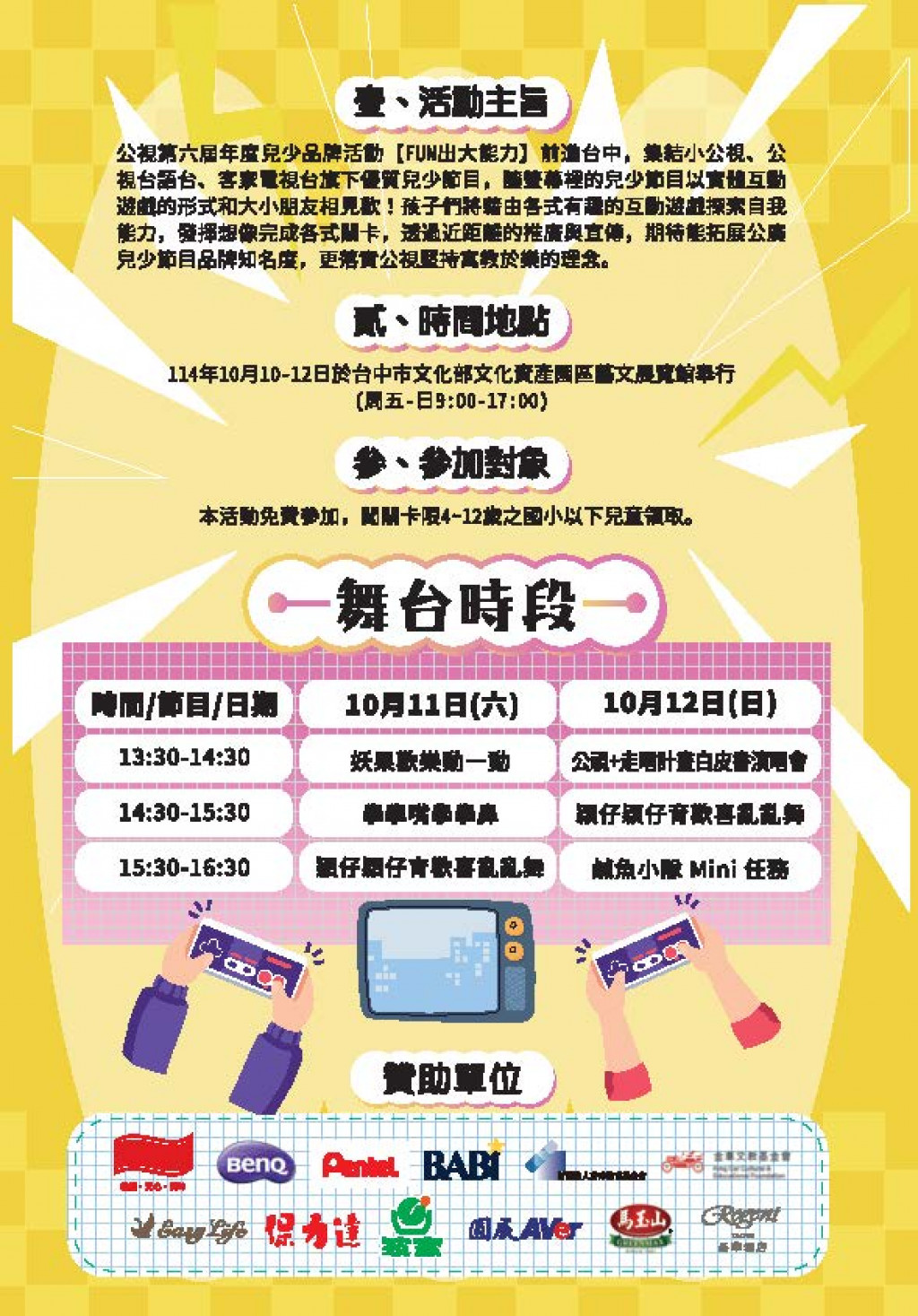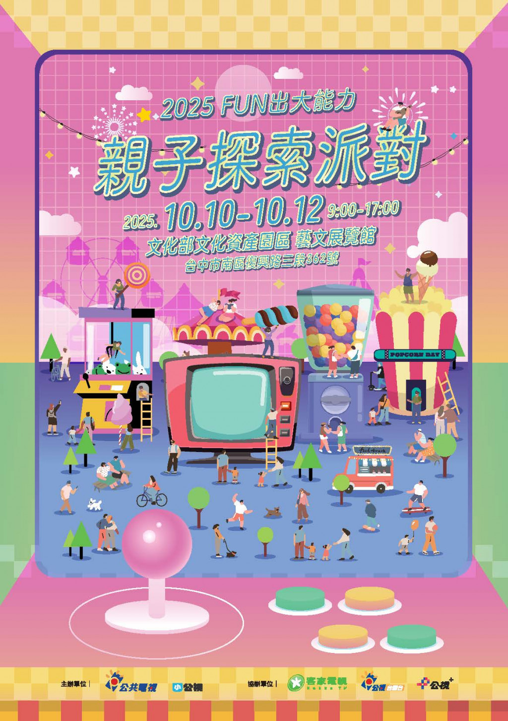 公視第六屆年度兒少品牌活動【FUN出大能力】前進台中,集結小公視、公視台語台、客家電視台旗下優質兒少節目,讓螢幕裡的兒少節目以實體互動遊戲的形式和大小朋友相見歡。【2025FUN出大能力】親子探索派對,10/10(五)-10/12(日)三天,在台中市文化部文化資產園區藝文展覽館(台中市南區復興路三段362號)。 |