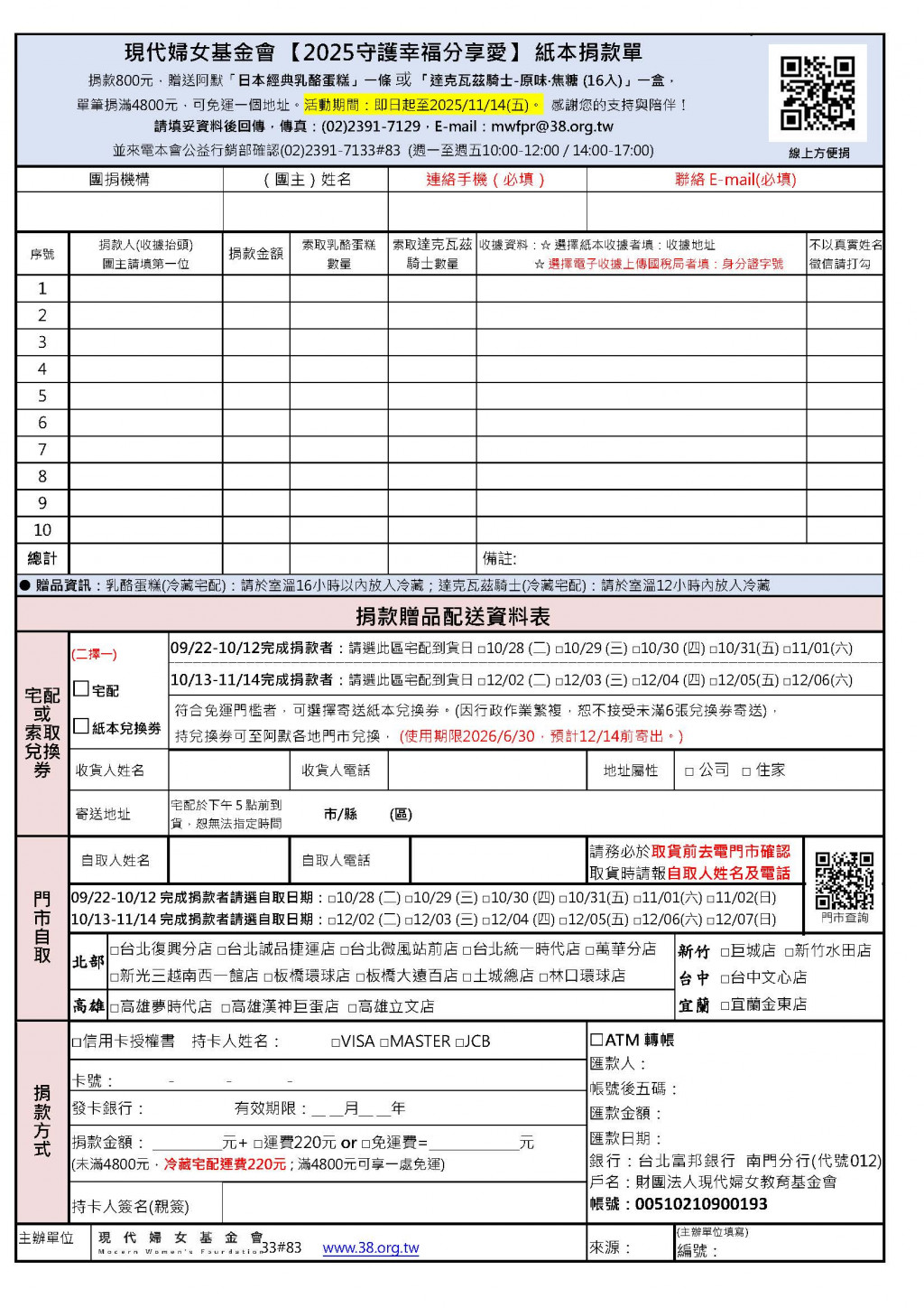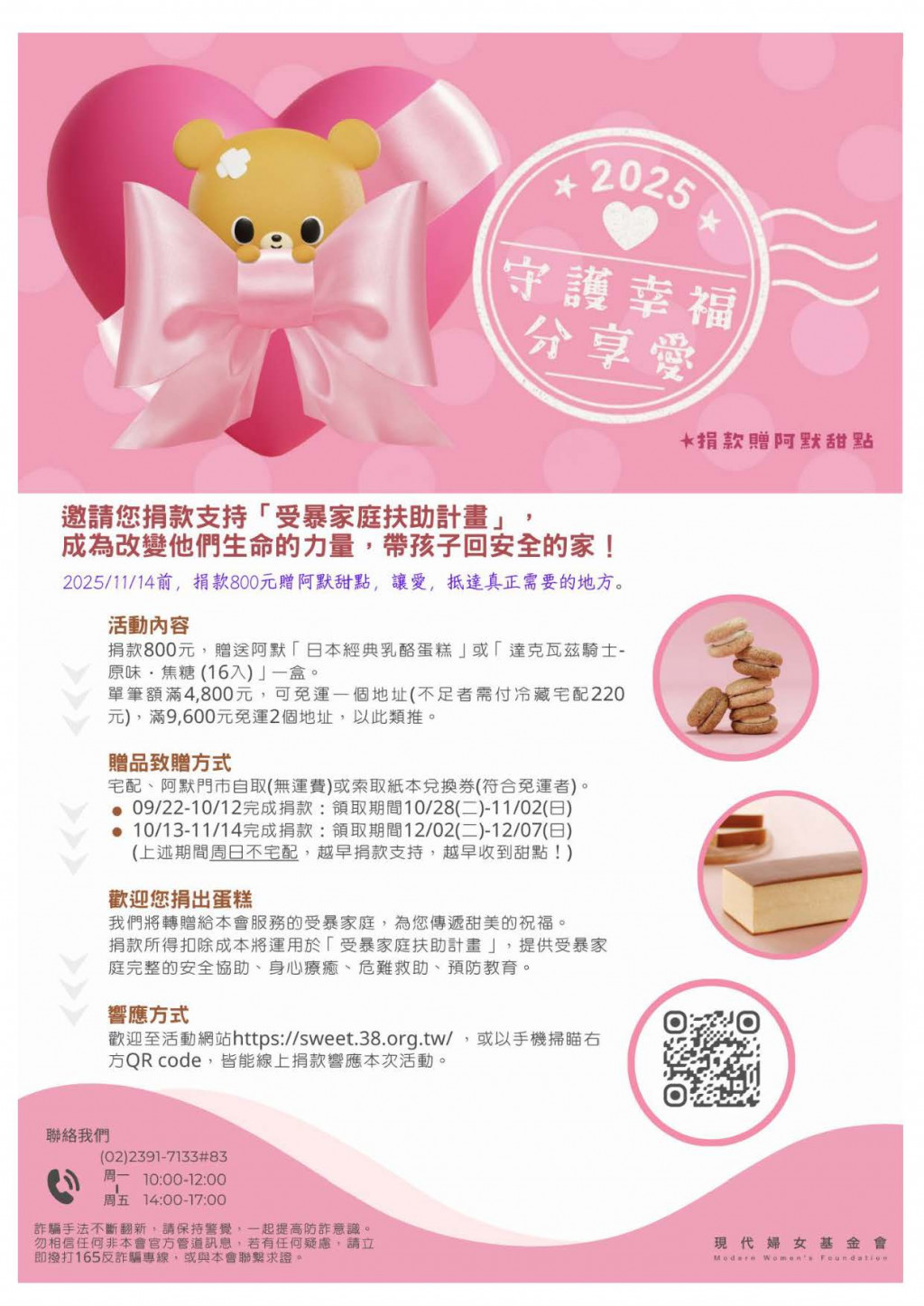 歡迎透過本會「2025守護幸福分享愛」活動網頁線上捐款https://sweet.38.org.tw,或傳真回覆紙本捐款單捐款(詳見附件一)。 |