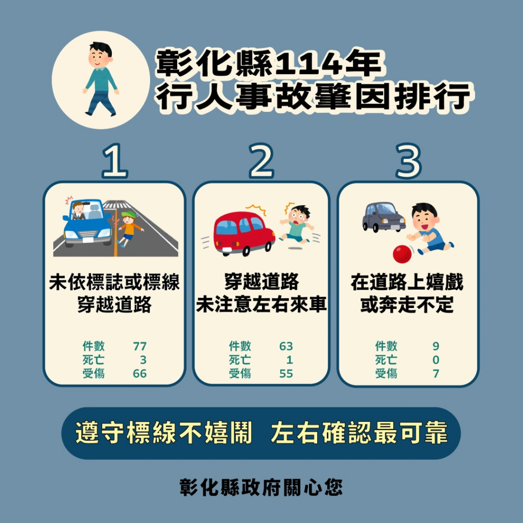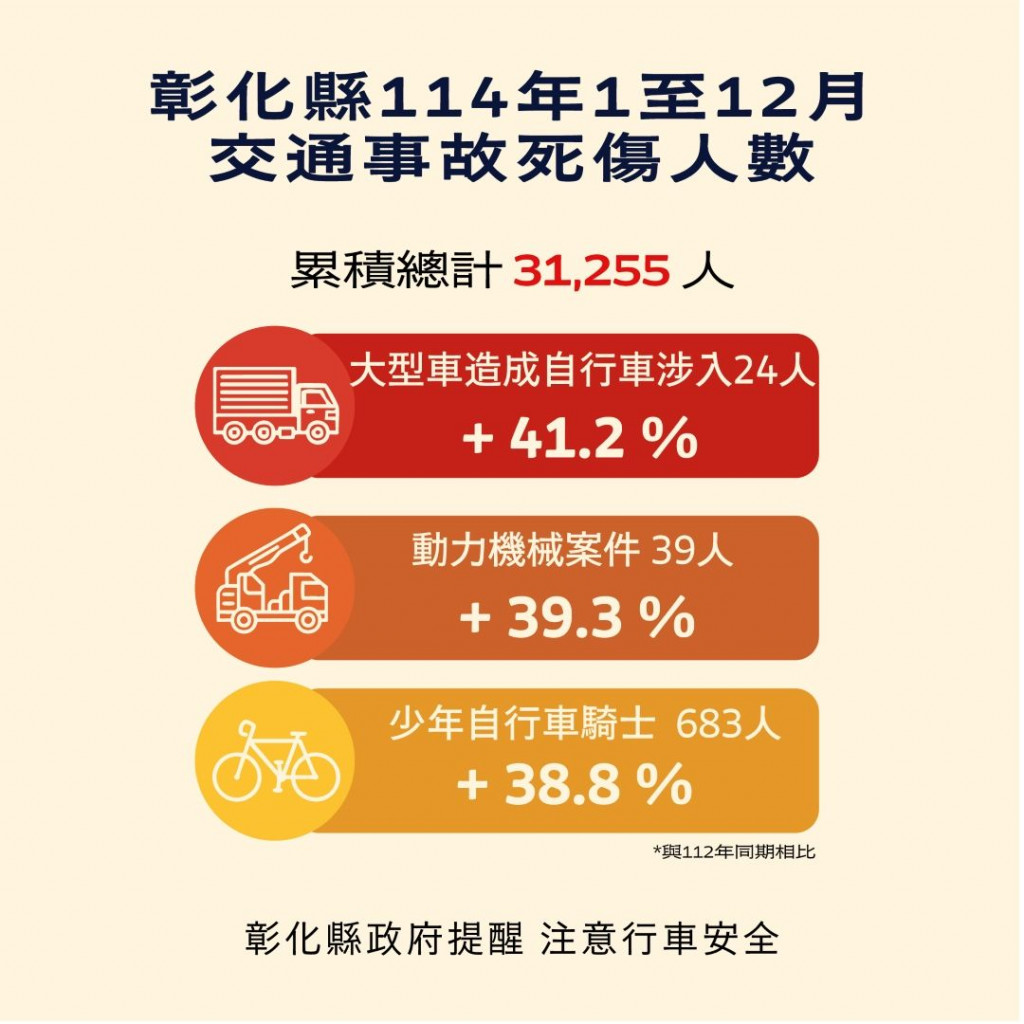 彰化縣114年1-12月道路交通事故死傷累計31,255人,請大家確實遵守交通規則